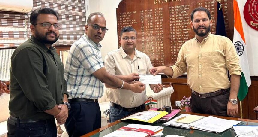 16 ਅਕਤੂਬਰ (ਗਗਨਦੀਪ ਸਿੰਘ) ਬਠਿੰਡਾ: ਡੀਸੀ ਰਾਜੇਸ਼ ਧੀਮਾਨ ਨੂੰ ਪੰਜਾਬ ‘ਚ ਆਏ ਹੜ੍ਹਾਂ ਦੇ ਮੱਦੇਨਜ਼ਰ ਹੜ੍ਹ ਪ੍ਰਭਾਵਿਤ ਖੇਤਰ ਦੇ ਲੋਕਾਂ ਦੀ ਮਦਦ ਲਈ ਇੰਡੀਅਨ ਮੈਡੀਕਲ ਐਸੋਸ਼ੀਏਸ਼ਨ (ਆਈ.ਐਮ.ਏ.) ਵਲੋਂ 3 ਲੱਖ ਰੁਪਏ ਦਾ ਚੈੱਕ ਭੇਂਟ ਕੀਤਾ। ਇਸ ਮੌਕੇ ਡੀਸੀ ਨੇ ਐਸੋਸ਼ੀਏਸ਼ਨ ਦੇ ਨੁਮਾਇੰਦਿਆਂ ਦਾ ਵਿਸ਼ੇਸ਼ ਤੌਰ ‘ਤੇ ਧੰਨਵਾਦ ਵੀ ਕੀਤਾ।