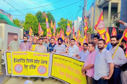 ਪੁਰਾਣੀ ਪੈਨਸ਼ਨ ਬਹਾਲ ਨਾ ਕਰਨ ਦੇ ਰੋਸ ਵਜੋਂ ਡੈਮੋਕਰੇਟਿਕ ਟੀਚਰ ਫਰੰਟ ਬਠਿੰਡਾ ਨੇ ਆਮ ਆਦਮੀ ਪਾਰਟੀ ਦੇ ਮੁੱਖ ਬੁਲਾਰੇ ਨੀਲ ਗਰਗ ਦੇ ਘਰ ਅੱਗੇ ਅਰਥੀ ਫੂਕ ਕੇ ਕੀਤਾ ਰੋਸ ਪ੍ਰਦਰਸ਼ਨ