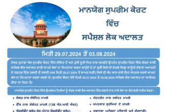 ਮਿਤੀ 29.07.2024 ਤੋਂ ਮਿਤੀ 03.08.2024 ਤੱਕ ਮਾਨਯੋਗ ਸੁਪਰੀਮ ਕੋਰਟ ਵਿੱਚ ਲਗਾਈ ਜਾ ਰਹੀ ਹੈ ਸਪੈਸ਼ਲ ਲੋਕ ਅਦਾਲਤ।